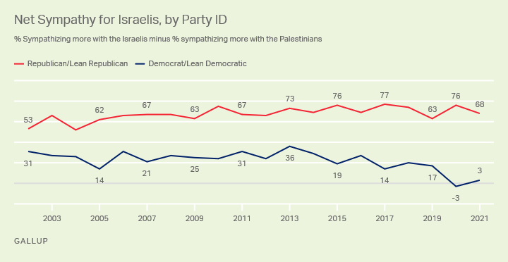 In the last ten years, I’ve seen a steady shift on the left away from acknowledging the uncomfortable complexity of the situation in favor of embracing simple stories about colonialism and oppression. (Polling from Gallup supports this sense, indicating a shift that is particularly pronounced among liberal Democrats.)
