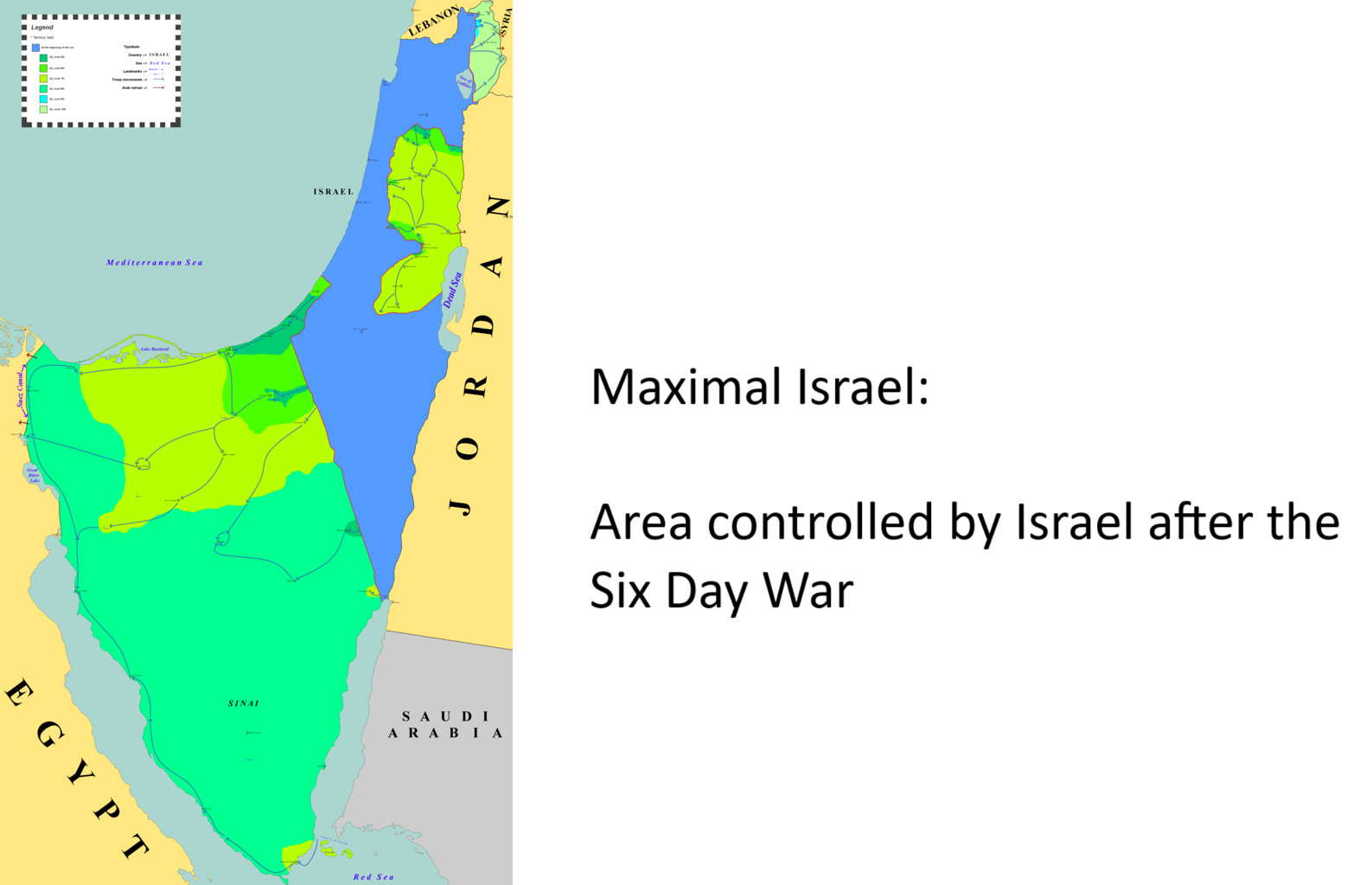Then came the Six Day War in 1967, and that changed the map in a big way. With rising tensions over the Suez Canal, Israel launched a pre-emptive attack, claiming that another Arab coalition invasion was imminent. The Arab states were caught off-guard and lost badly. Israel took not only the West Bank and the Gaza Strip, but also the Golan Heights (from Syria in the North) and the entire Sinai Peninsula from Egypt, pushing the border all the way to the Suez Canal.