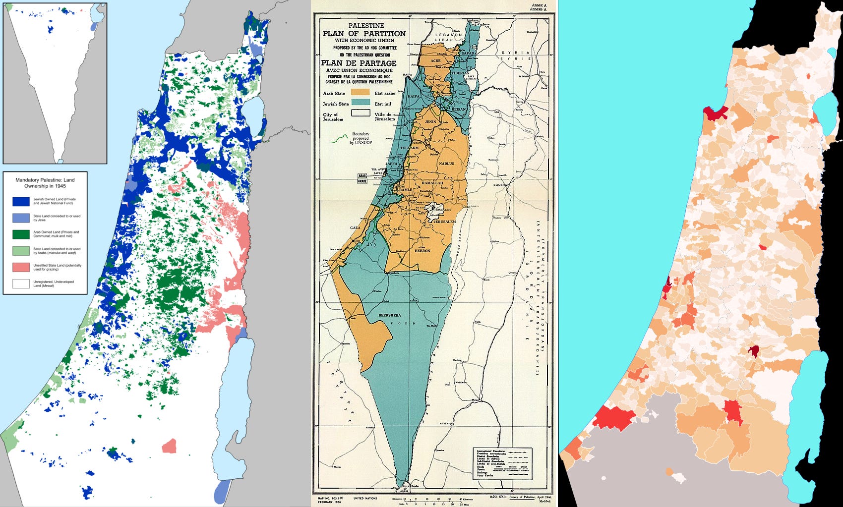 In 1947, the United Nations drew up a plan for the amicable division of what was then called “Mandatory Palestine” between territories populated by what were then known as “Palestinian Jews” and “Palestinian Arabs.” This plan was based on patterns of residence, which can be seen in the land ownership map above.1