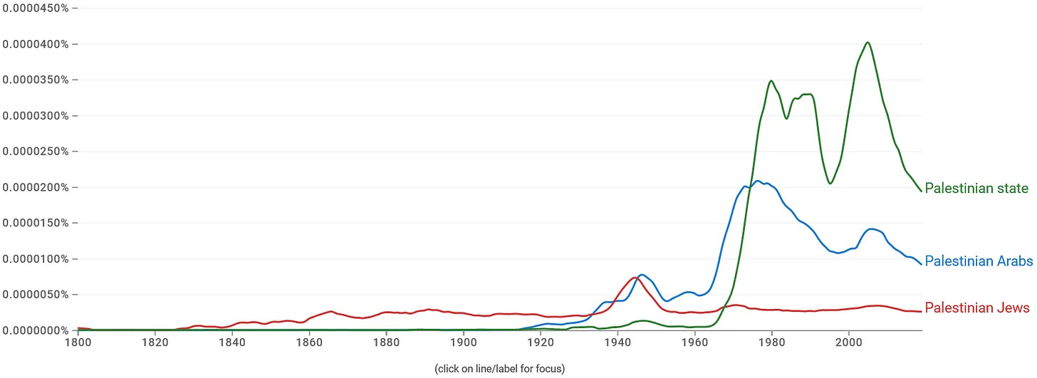 After a brief surge in the use of the term “Palestinian state” in the 1940s with the founding of Israel, the term essentially vanishes from Google’s n-gram corpus until the 1960s. In 1967, with the Six Day War, “Palestinian state” surged to match the popularity of “Palestinian Jews,” a phrase that one rarely hears today. Around 1973, after the Arab League was defeated a third time, usage of the term took off like a rocket.5 In 1974, the UN recognized the Palestinian Liberation Organization as the representative of the interests of Palestinians in occupied territories held by Israel.