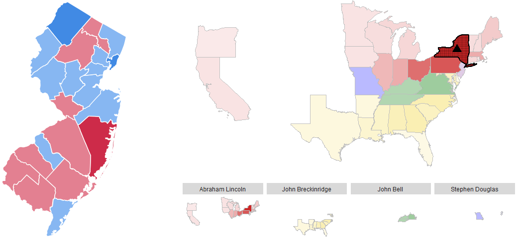 The anti-Lincoln fusion ticket in New Jersey earned 52% of the vote in New Jersey. However, due to organizational failures by anti-Lincoln opponents, only three of the seven fusion anti-Lincoln electors were on all of the fusion ballots across New Jersey. Stephen Douglas received three electoral votes; however, with four designated “fusion” electors and five additional “straight Douglas” electors in competition, Lincoln was able to secure the other four of New Jersey’s electoral votes.5
